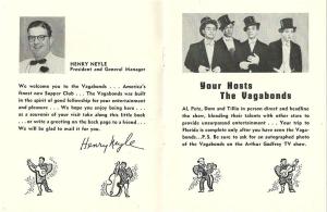 Two years before the Vagabond Motel went up on the Upper East Side, another place with a similar name – the Vagabonds’ Club – opened its doors at 732 Biscayne Blvd., a block north of the Freedom Tower. A 300-seat supper club with a lounge, stage, and full kitchen, the Vagabonds’ Club was named after its owners, a comedy quartet called ‘The Vagabonds.’ The Vagabonds achieved stardom in the early 50’s after appearing on the popular TV show ‘Arthur Godfrey and Friends.’ Their club quickly became one of the hottest spots in town.